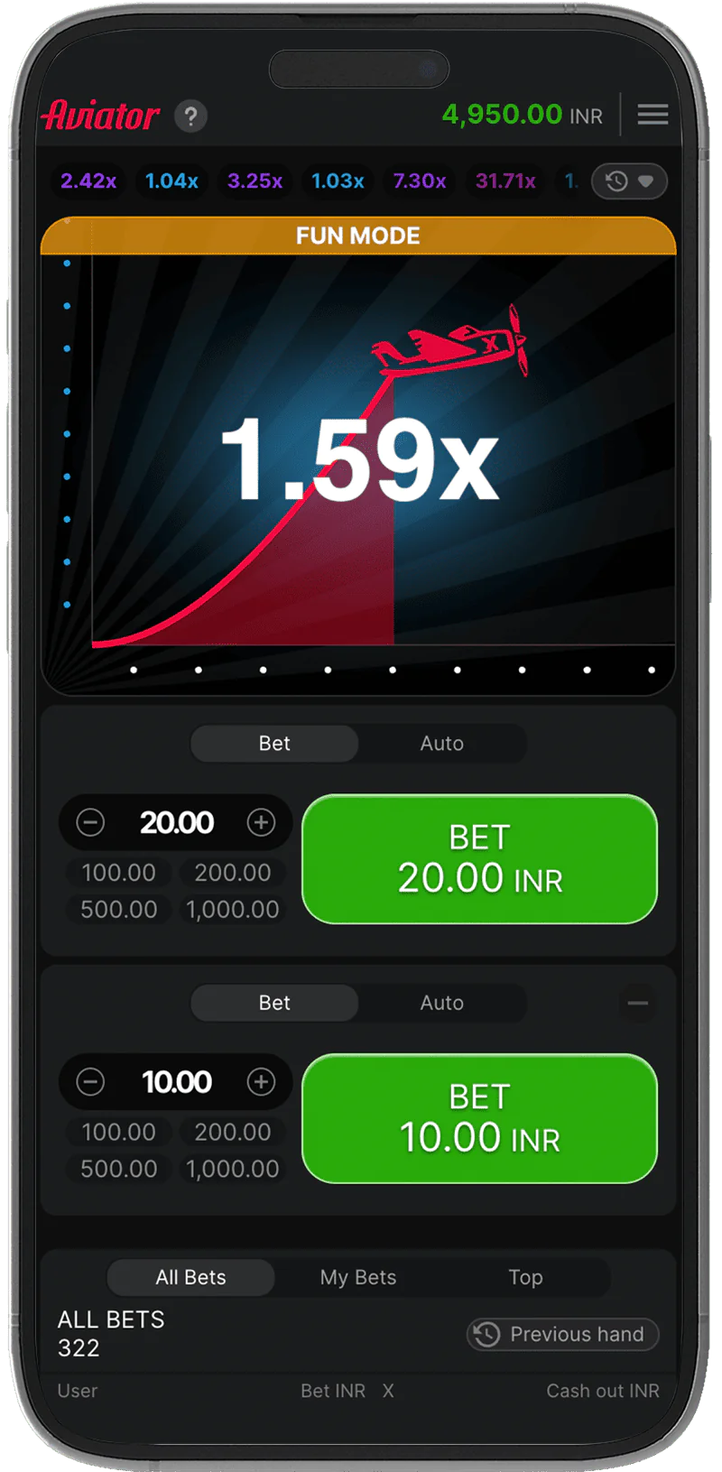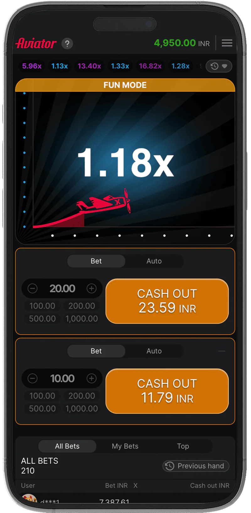 Screenshots of the 96in Aviator App for Indian Gamblers